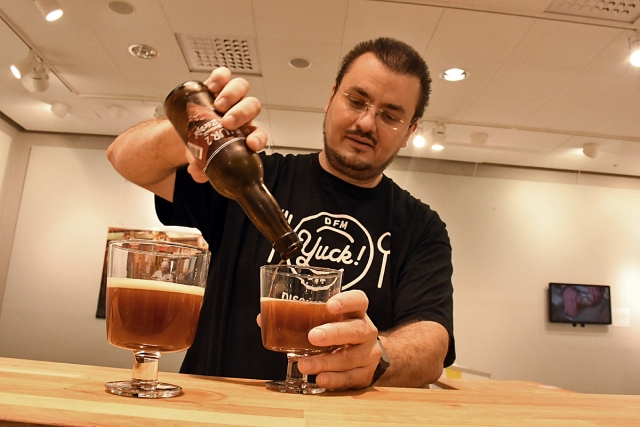 Beernews fick prova ölet som gjorts på fårbajsrökta valtestiklar. Andreas Ahrens hällde upp ölet som faktiskt smakade helt okej.