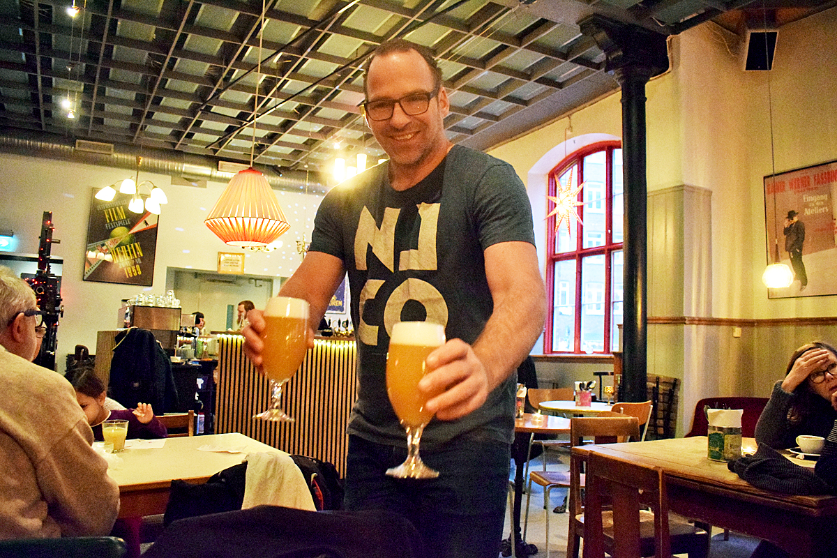 Andre Milsem med två Gbg Beer Week i händerna. Han trivs onekligen i sin egen "kyrka".