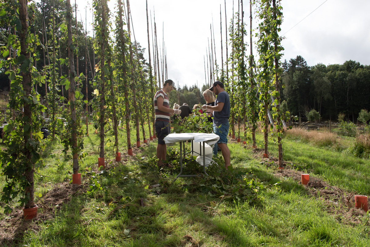 I lördags samlades ett gäng bryggare och hembryggare på Yxsjöns humleodling i Benareby utanför Mölnlycke för att skörda årets humle.