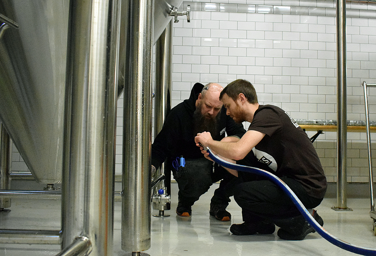 Det är många små detaljer att hålla koll på i ett bryggeri. Här är det Kristian Berntsson och Erik Brimstedt som samarbeter.