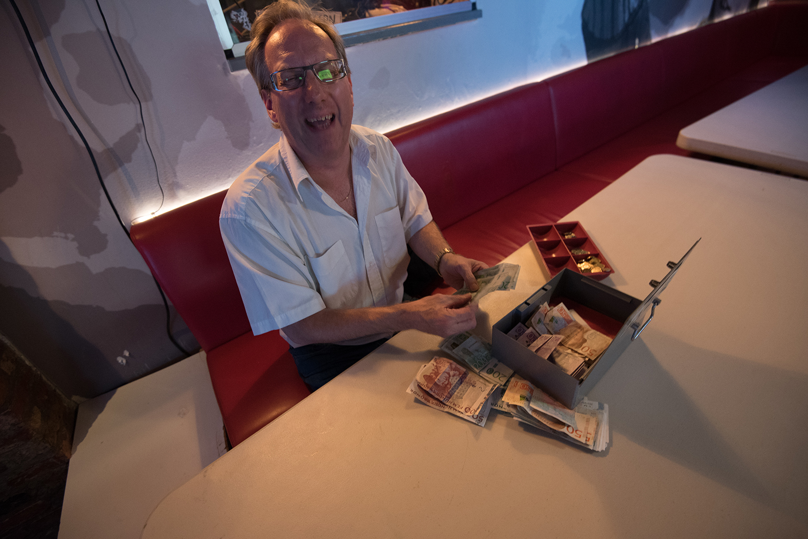 Martin Hansen från Ölfrämjandet räknar intäkterna med viss glädje efter ett fullsatt möte.