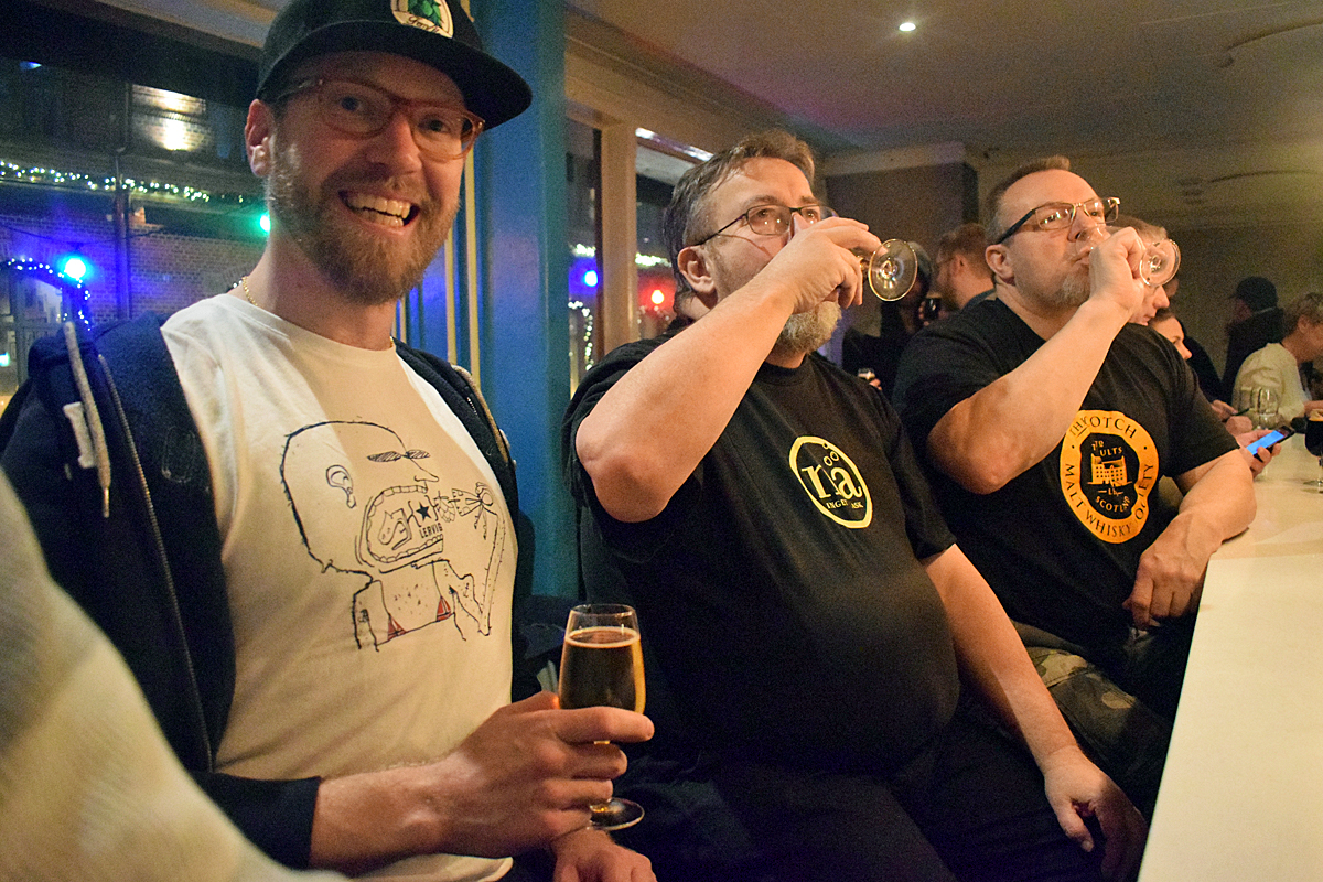 Erik Sjölund visade upp sin Lervig-tröja, medan Mats Gunnarsson och Patrik Bruckner ägnade sig åt någon form av synkroniserad öldrickning.