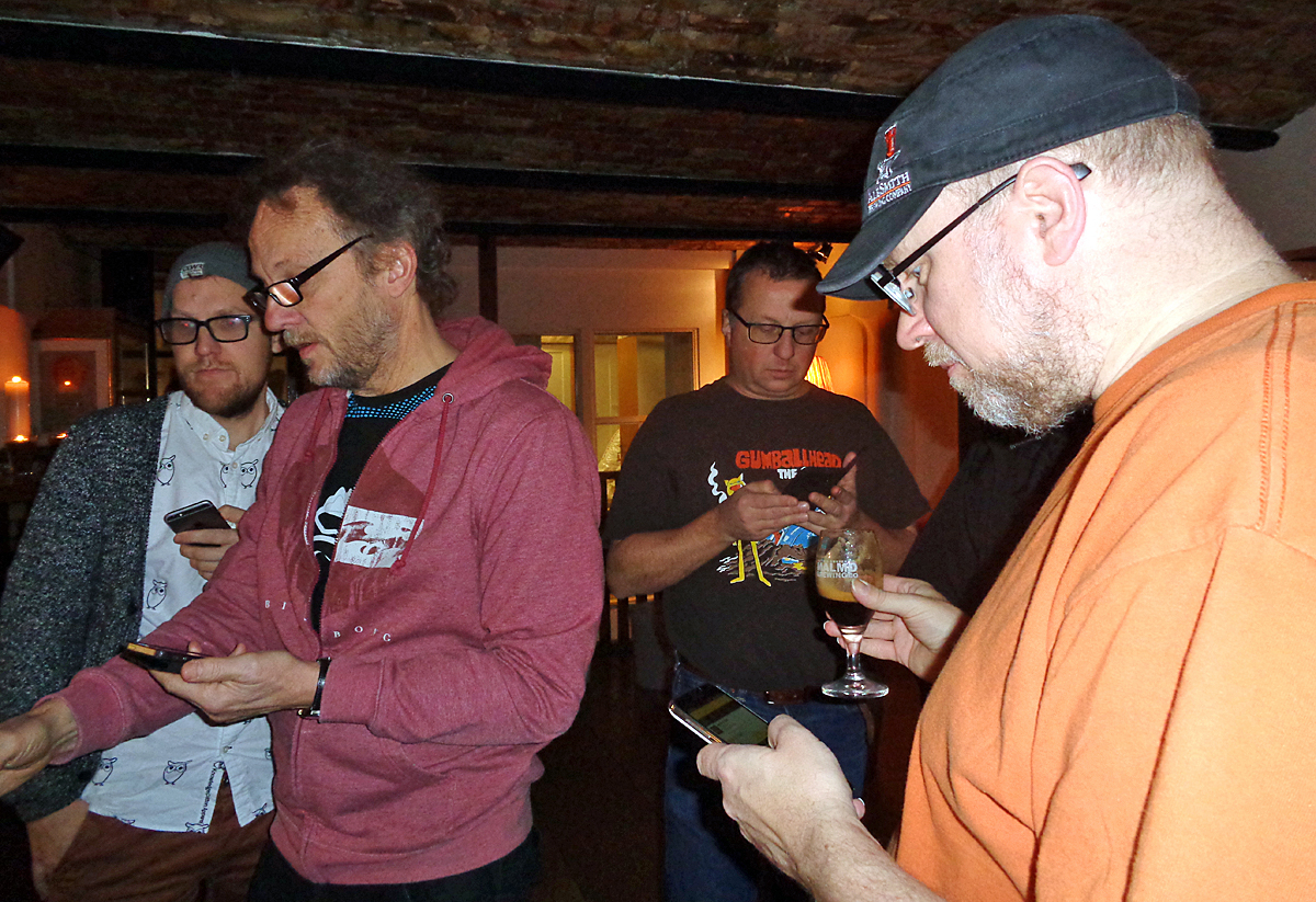 Att få in ölen på Untappd är en inte oviktig del av en ölfestival. Här är det Fredrik Svensson, Per Svensson, Anders Hall och Lennart Sandberg som umgås med sina smartphones. Foto: Björn Hall