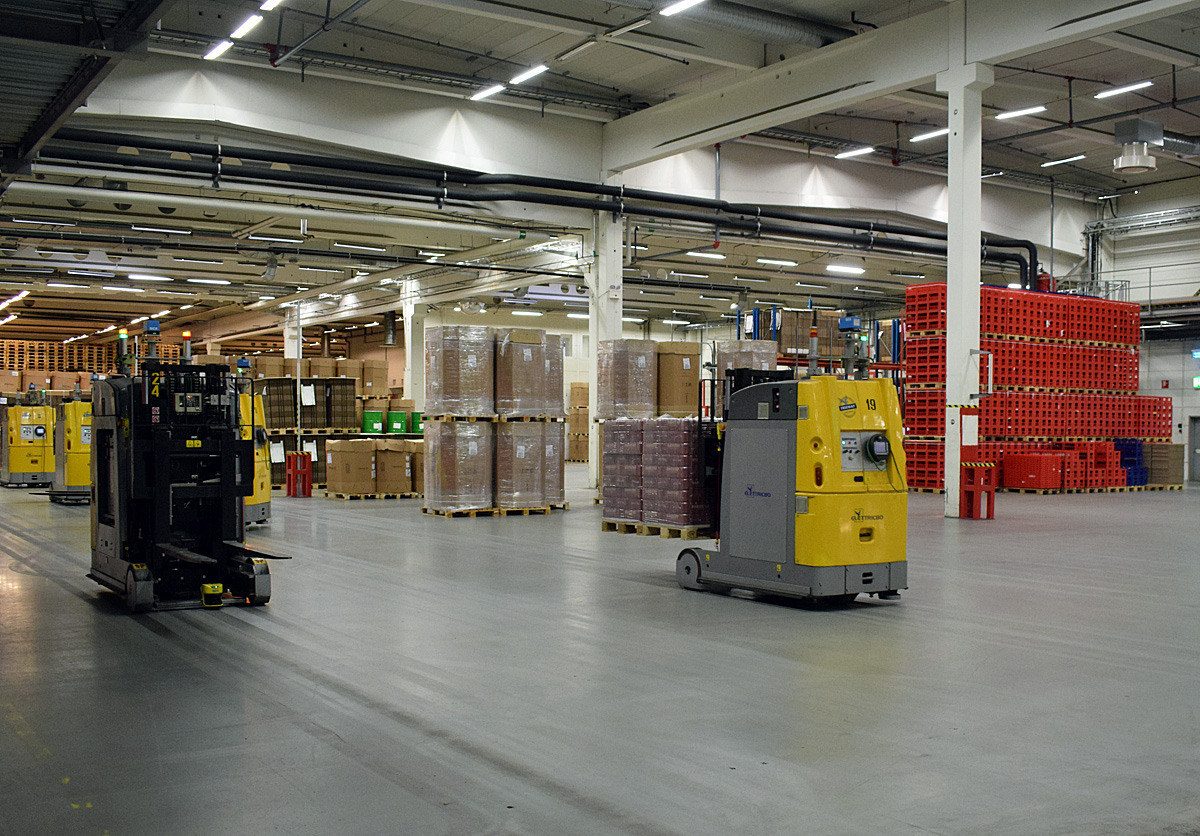 "Kycklingar" kallas de förarlösa truckar som flyttar runt pallarna på lagret.