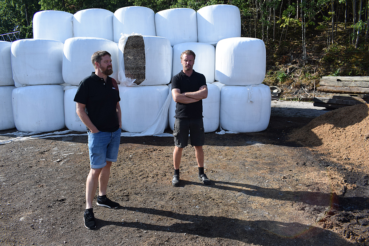 Hö är fortfarande den viktigaste maten för djuren, men både Mats Wahlström och Henrik Johansson är glada över att dravet från Poppels bryggningar kommer till användning.