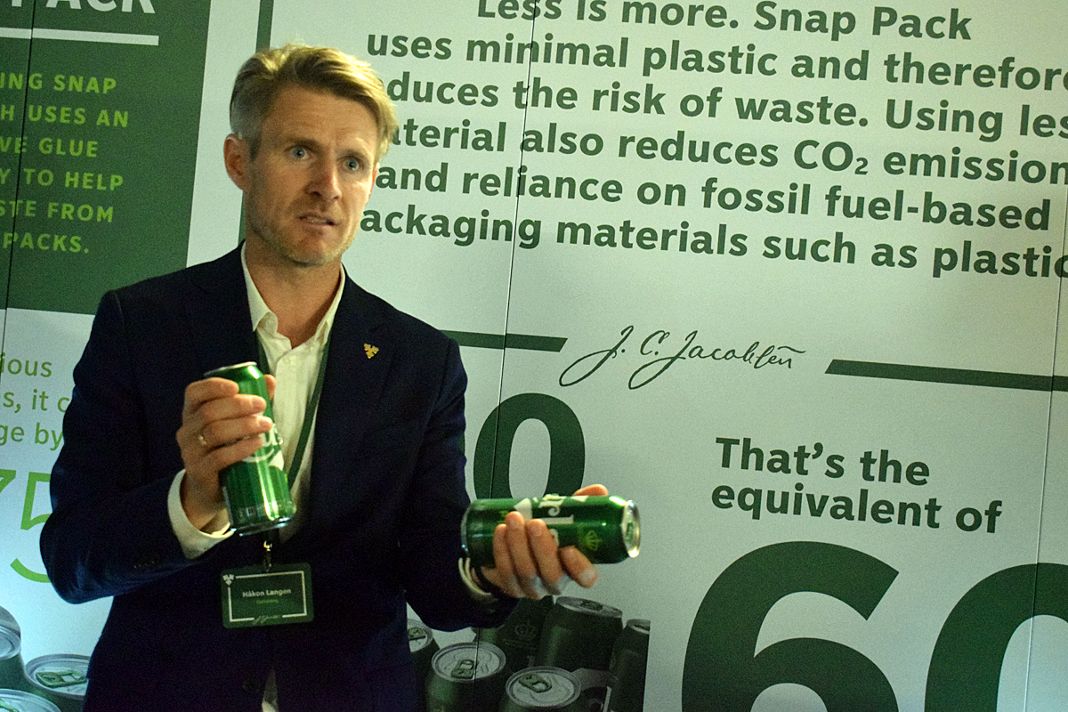 – Handtaget är i plast men resten hänger samman med en ny form av lim. Det här förhindrar att plast hamnar i naturen, sade Carlsbergs Hakon Langen under premiärvisningen.