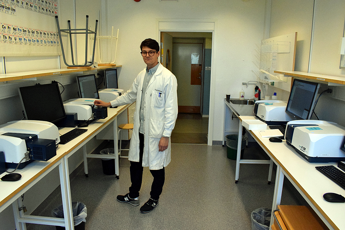 Joshua Myers visar laboratoriet där de nya apparaterna kan ta reda på det mesta om bland annat ölets egenskaper.