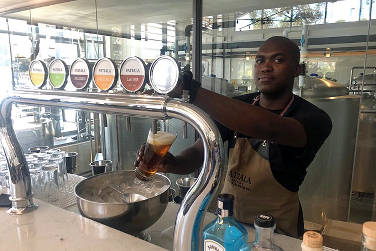 Thabo är en av de anställda som ser till att den egenproducerade ölen flödar i kranarna.