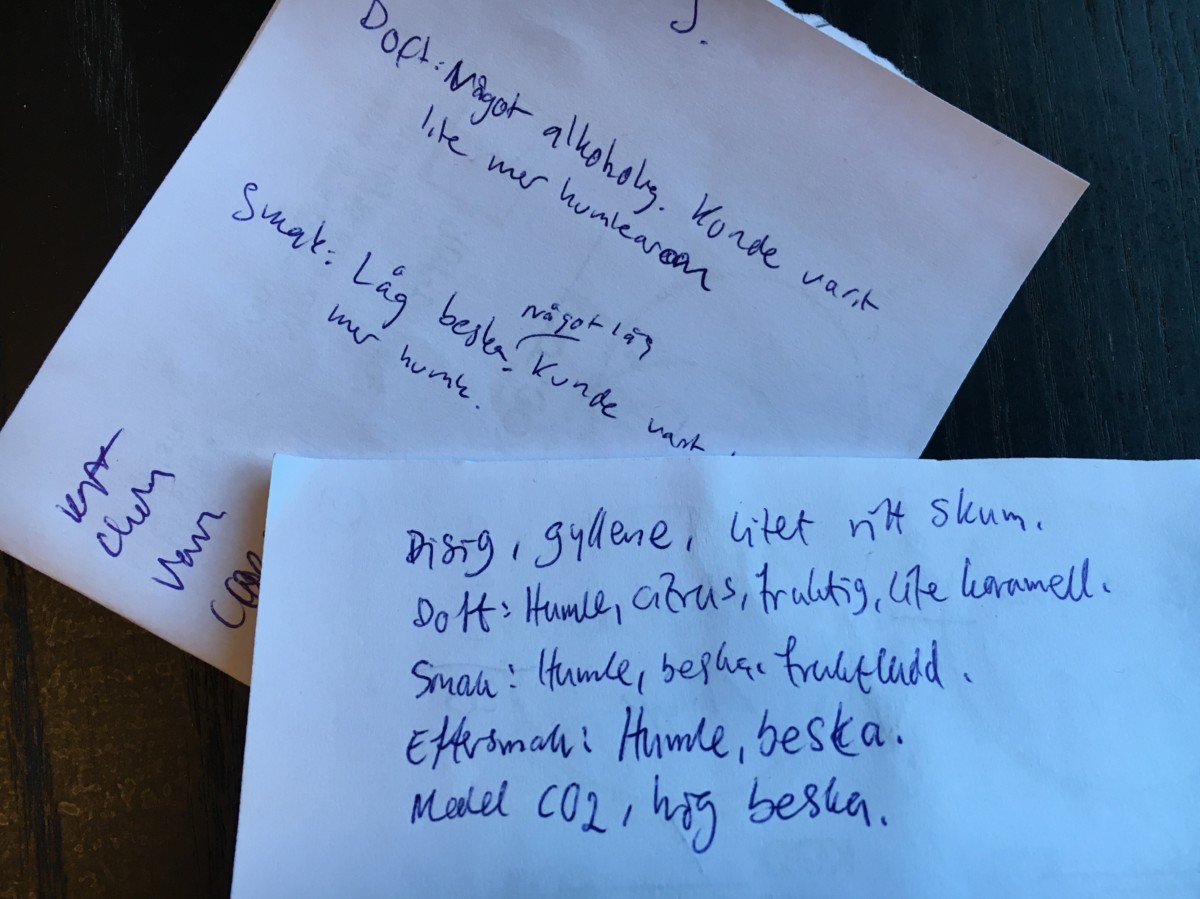 I mitt inre hörde jag dem redan innan de ens smakat på ölen: “infekterad”, “syreskadad”, “DMS”, “brittisk IPA” och alla andra felsmaker jag kunde tänka mig. Domarna är uppdelade på två rum. Jag gör entré i det första och häller upp ölen med darriga händer. Domarna tar varsitt glas. De ser allvarliga ut. Smuttar lite försiktigt. Spottar ut. Skriver på sina små lappar men säger ingenting och jag börjar svettas. Allt jag vill är att de säger “drickbar”. Ronny Karlsson, min kollega på Beernews, som är där för att fotografera, skrattar rått och fotograferar naturligtvis när Thomas Mattsson spottar ut mitt förstlingsverk.