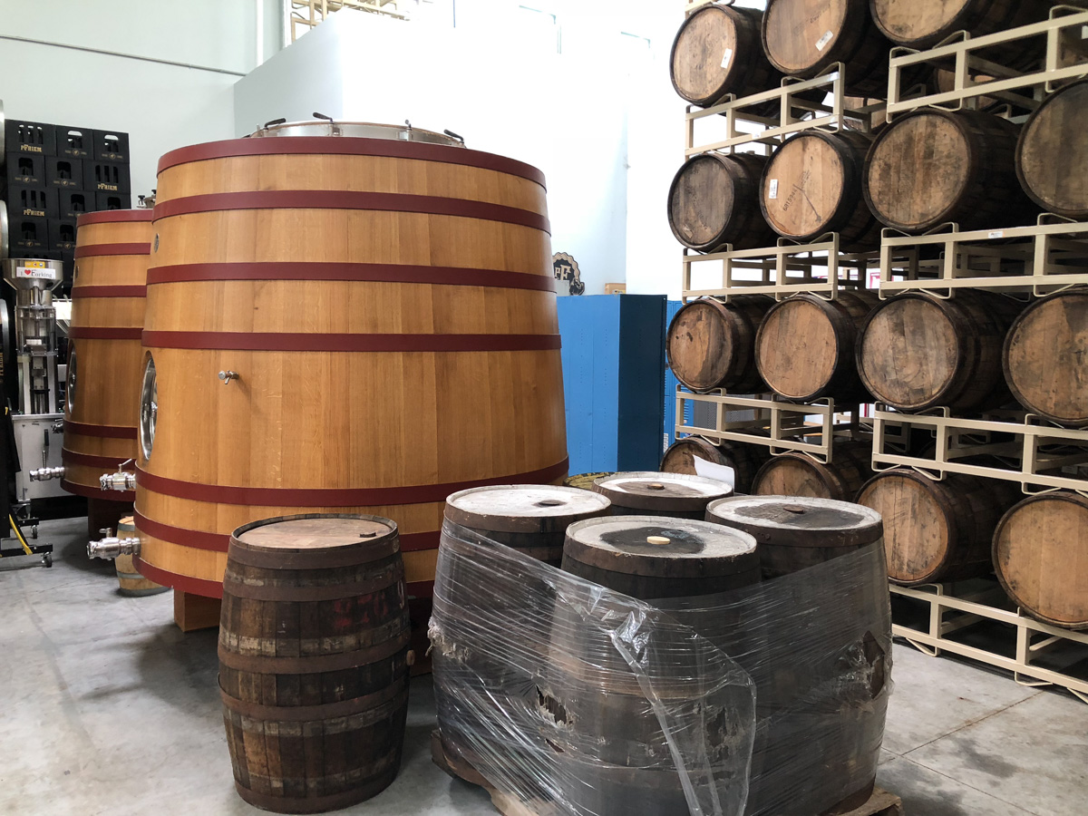 I ena änden av den stora bryggerilokalen fick vi se ekfatsparken. De flesta faten var tomma vid vårt besök, efter blandning och buteljering, i väntan på säsongens frukt och ny påfyllning. Lindsey beklagade sig över att romfat som de får alltid ser bedrövliga ut och ofta läcker, jämfört med vin- och bourbonfat. I samma lokal står ståltankar för blandning och konditionering samt två foeder, och man planerar att installera ett kylkar/koelschip till hösten. Nästan all vildjäst öl blandas med frukt under processen och blandas innan buteljering.
