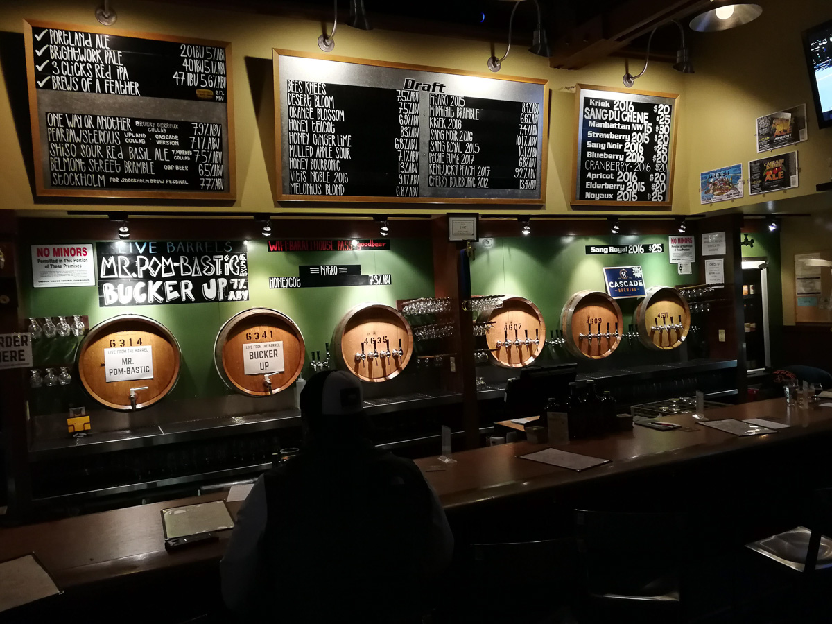 Cascade kommer från Portland och är högt ansedda världen över. Ingen av oss två har blivit riktigt imponerade tidigare, men det var ändå ett självklart stopp när vi var i stan. Efter en grundlig genomgång av fatölen, blev vi ändå imponerade. Överlag riktigt mycket och komplex smak och riktigt bra tryck i syran. Cascade hade besökt festivalen Katarina Kegger/Stockholm Brewers Festival just innan vårt besök på bryggpuben, och det var kul att smaka Stockholm is Where the Tart is, som man bryggt för den festivalen. Ett par öl stack ut från mängden, som Honeypot – en syrlig öl med tydlig honungssmak utan för mycket sötma – och Cherry Bourbonic Plague från 2012.
