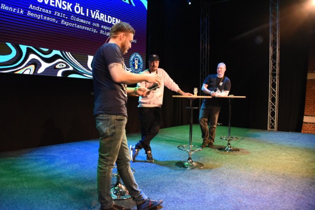 Cornelius Löfmark var konferencier och ledde ett antal föreläsningar, här pratar Henrik Bengtsson och Andreas Fält om Svensk öl i världen.