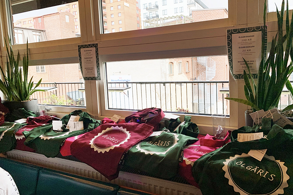 I samband med tvåårsjubileet fanns det förstås Ölgäris-prylar att köpa med sig hem. (Foto: Lise Ljungman)