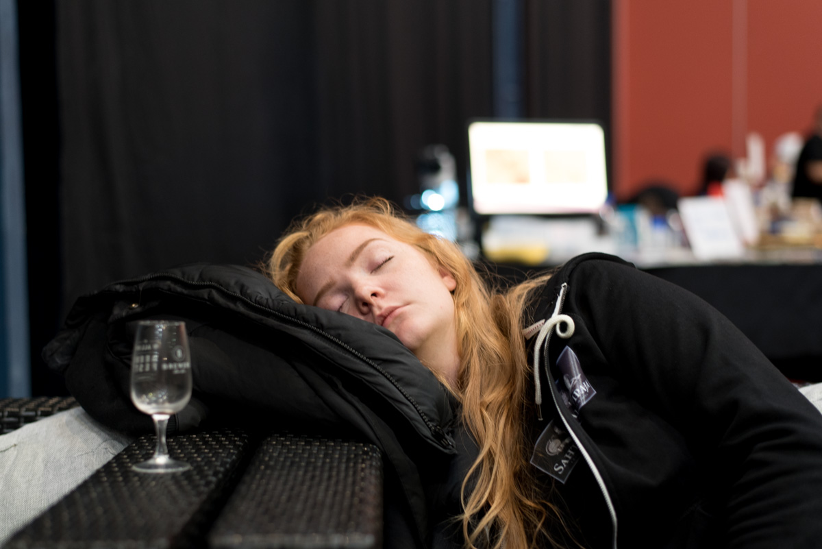 Lite vila mellan passen – Amanda Krjukoff på Sahtipaja passade på att sluta ögonen en stund mellan pass ett och två.