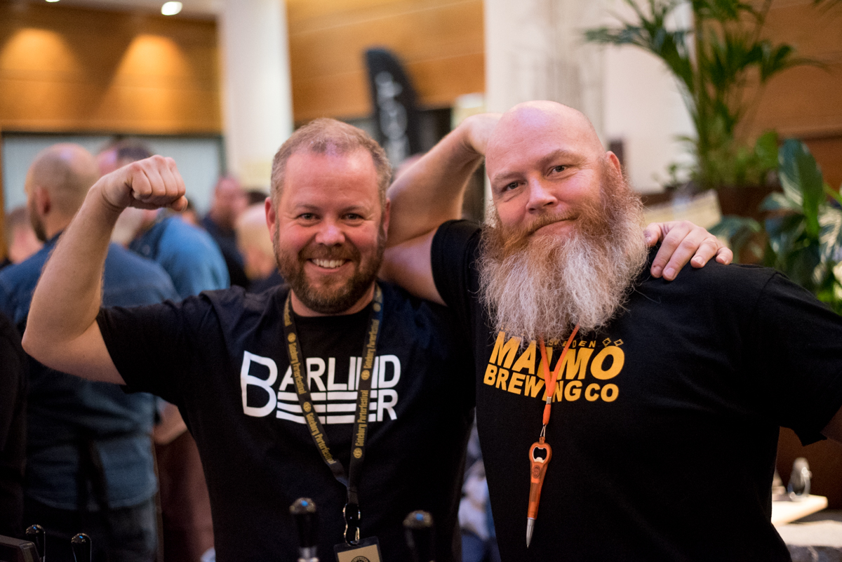 Jens Olevik visar musklerna tillsammans med Anders Hansson från Malmö Brewing Co. "2011 tog jag med min första brygd hit, Cacao-Porter. I år har jag med mig en lagrad sjuårig Cacao Imperial Stout.", säger Anders Hansson.