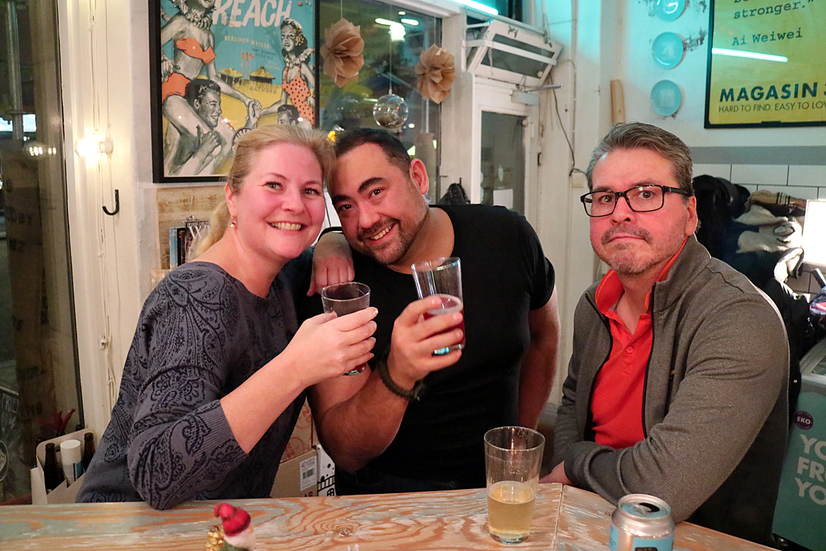 Jessica Heidrich, Mikael Göransson och Magnus Karperyd passade på att prova lite ny folköl under ettårsfesten.