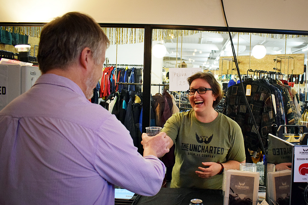 Linda Reidy från Uncharted var på bästa humör när hon serverade öl till Bosse Bergenståhl från Lundabryggeriet.