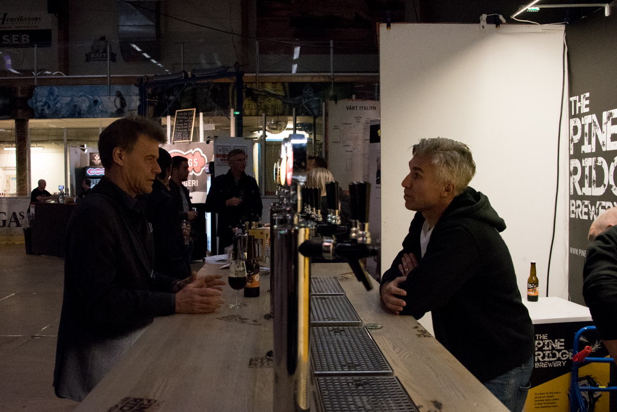 Anders Flyckt från ölfrämjandet hade åkt upp från Skåne till Kungsbacka för att besöka mässan. Här pratar han med Fredrik Johansson, delägare i Pine RIdge Brewery.