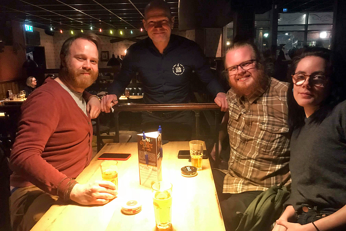 Göran från U&Me Beer gratulerar tre lyckliga quizvinnare.