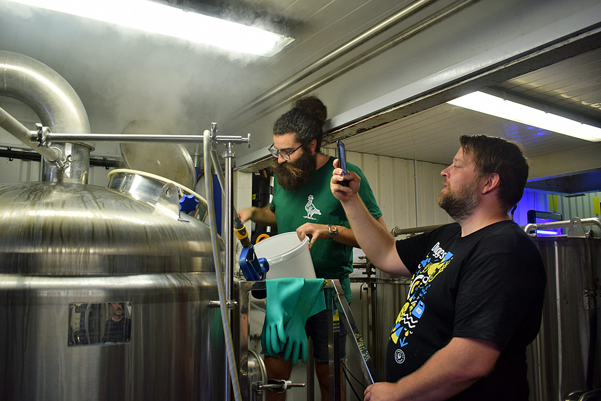 Daniel Gambino och Tomas Halberstad under bryggningen. Det ska inte bara göras öl, det ska dokumenteras också.
