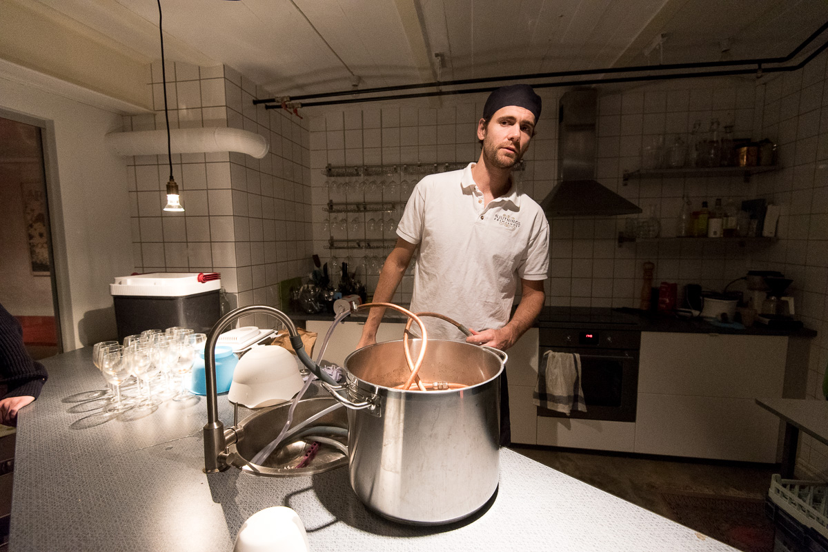 När koket är klart kommer är det dags för att flytta över vörten till jäskärlet, ett moment där Simon betonar renlighet och desinfektion med en emfas som får alla närvarande bakterier att fly fältet.