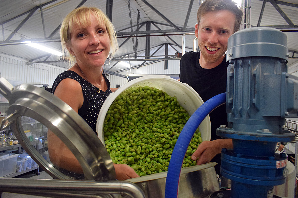 När humlen var skördad bar det av till bryggeriet, där Peter Robertsson hade förberett genom att göra kokningen medan plockningen pågick. Att brygga med färska kottar var en ny utmaning, men Robertsson hade fått en del hjälp från andra sidan jorden.