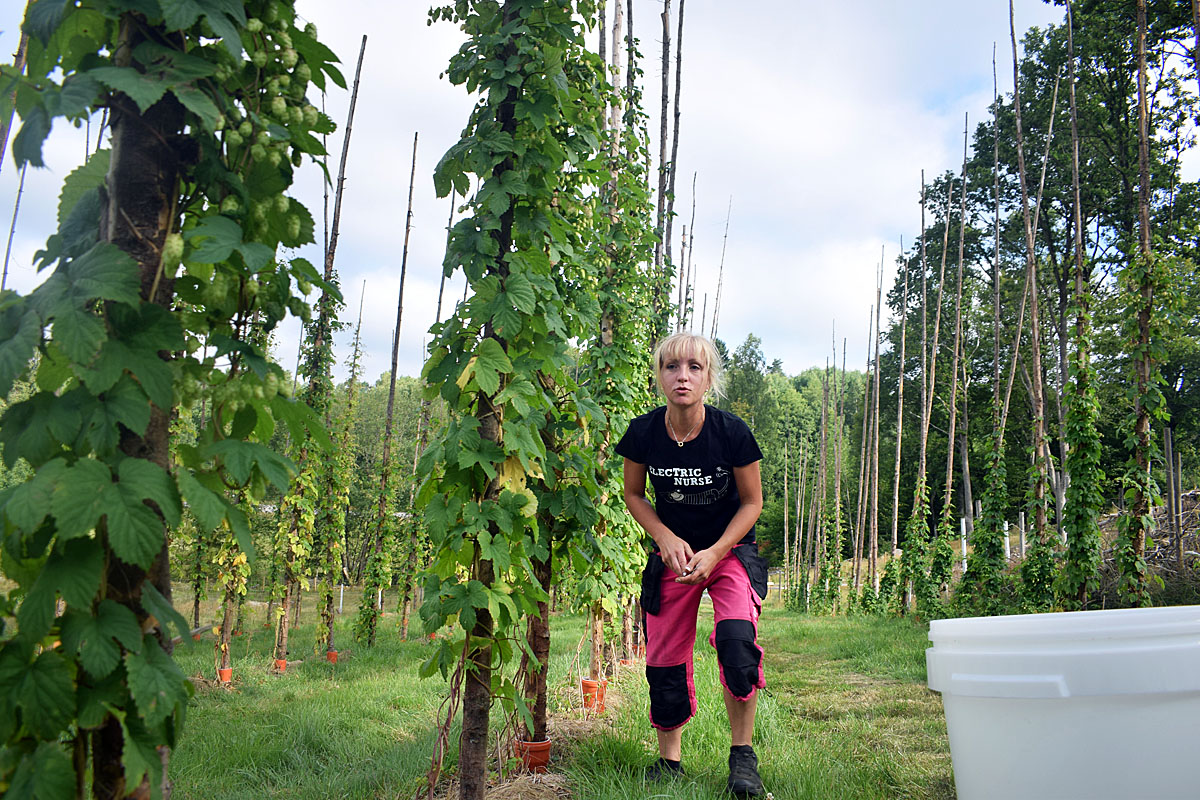 Hon var imponerad av den mängd kottar som kommit fram redan under det andra året för odlingen. Normalt sett tar det åtminstone tre år innan humleplantorna ger full skörd.