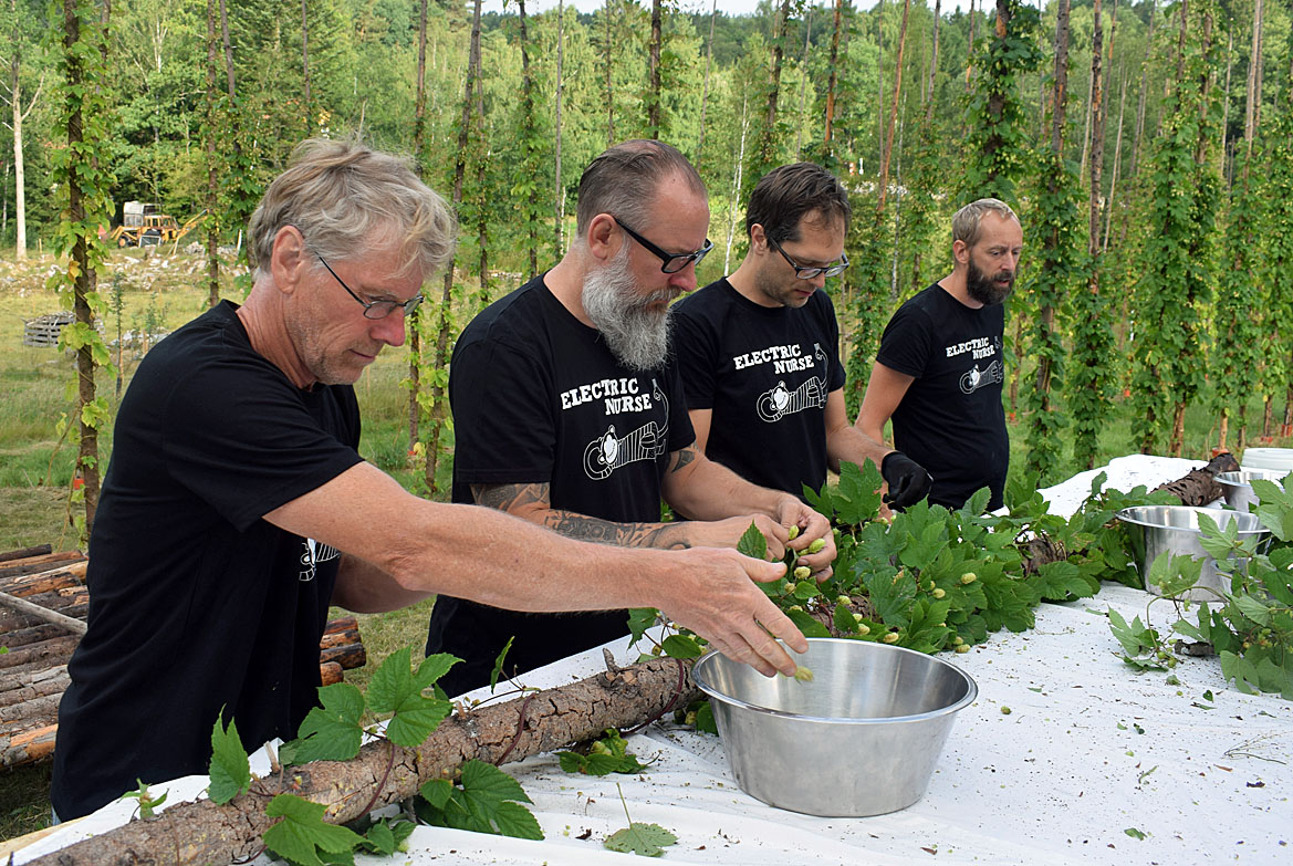 Därför var humleplockningen i gång tidigt under tisdagsmorgonen vid Yxsjöns Humlegård. Ägarna Erik och Carolina Råberg var förstås på plats, liksom Peter Robertsson och Ida Engström från Electric Nurse. Dessutom hade Erik Händén, Matz Krångh, Anders Björklund och Sonny Knudsen ställt upp frivilliga för att plocka humle.