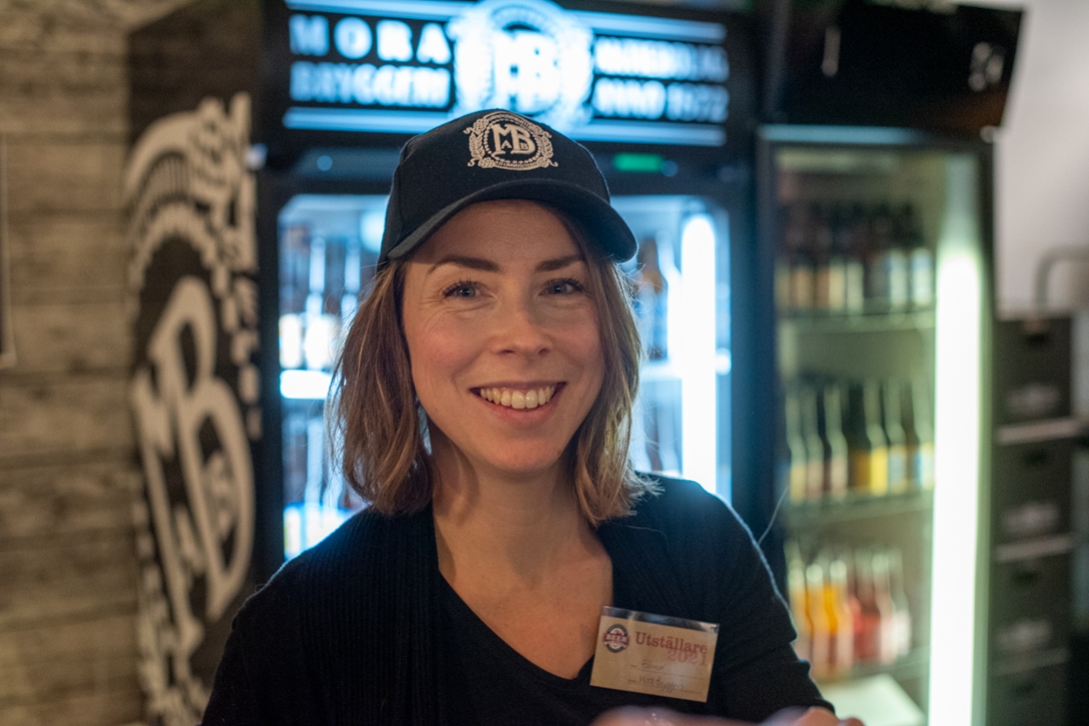 Andra generationen på Mora Bryggeri i form av Ellinor Andersson Stridh serverar glatt på mässan. Foto: Peter Lindh