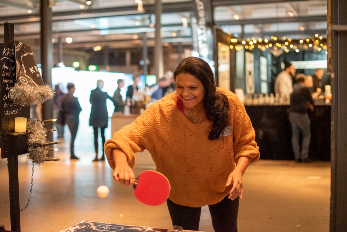 Ana Wahlström besegrar Mats Sundell med en kantboll vid pingisbordet. Paret skulle återvända varje timme för att se om de var tillräckligt nyktra för att vara kvar. Foto: Peter Lindh