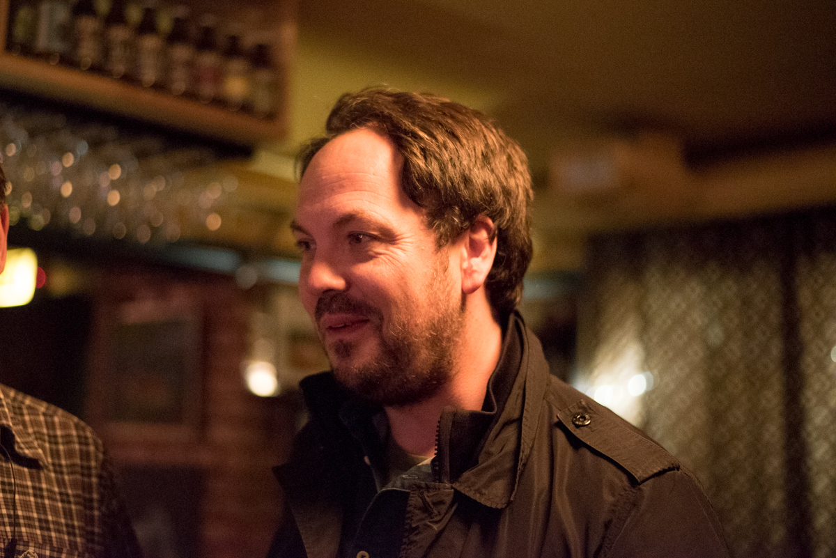 Fredrik Berggren, känd ölprofil i Göteborg, tittade in på Flying Barrel för att gratulera männen bakom boken.