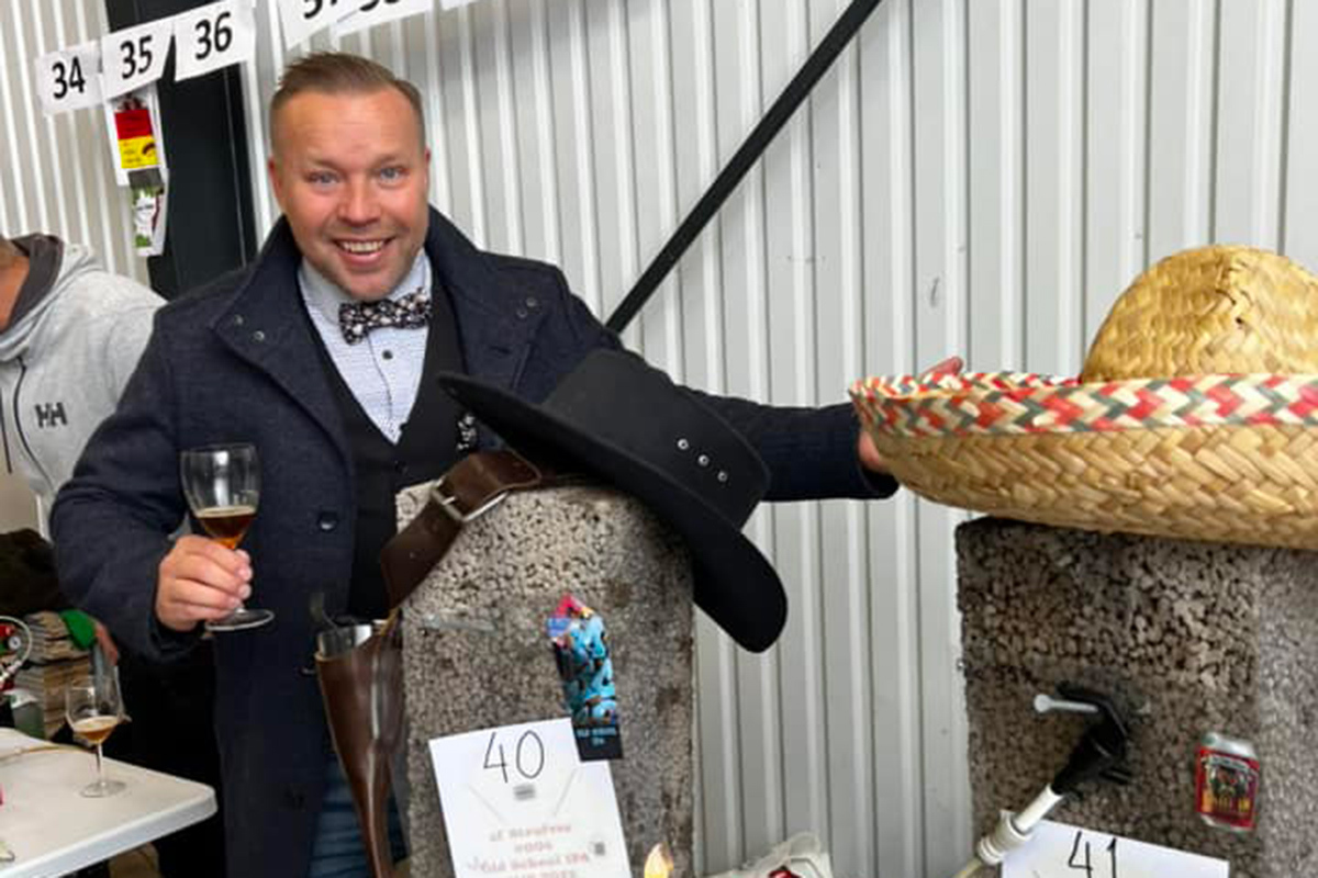 Anders Jacobsson bjuder på ett smakprov av ölet ”stärkande starköl”. Foto: Hönö Ölagille