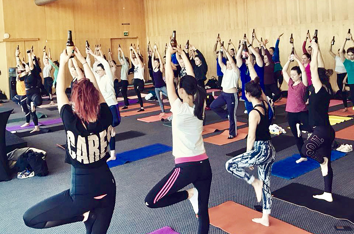 – Grunden är den vanliga yogan, men man håller i en ölflaska hela tiden och det gör det hela lite svårare. Man kan dricka lite under tiden men man hinner inte få i sig några enorma mängder. Det är en kul grej, en yoga med en liten tvist, säger Berglund.
