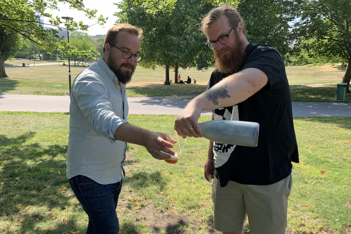 Claes Eliasson bjuder Tobias Öholm på öl.