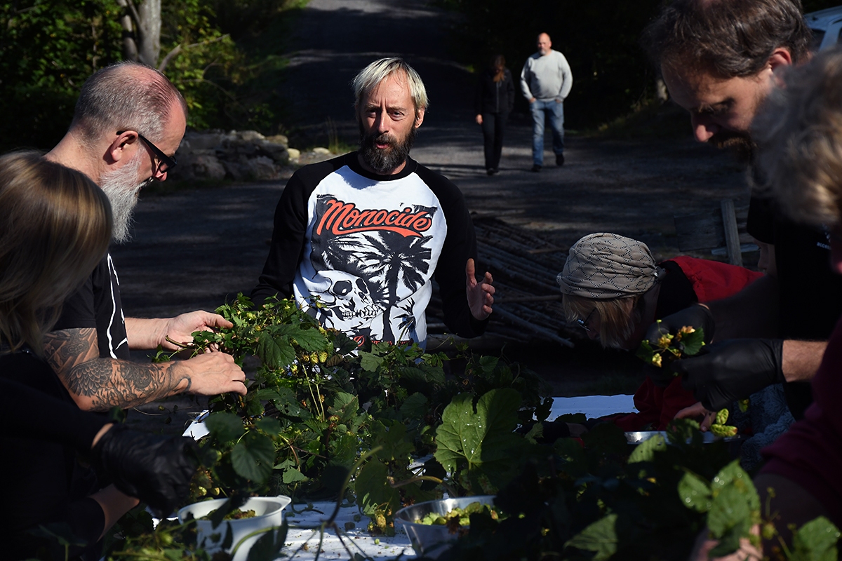 Det var ett 20-tal bryggare, hembryggare och andra som samlades under söndagen för att ta hand om årets skörd av humle.