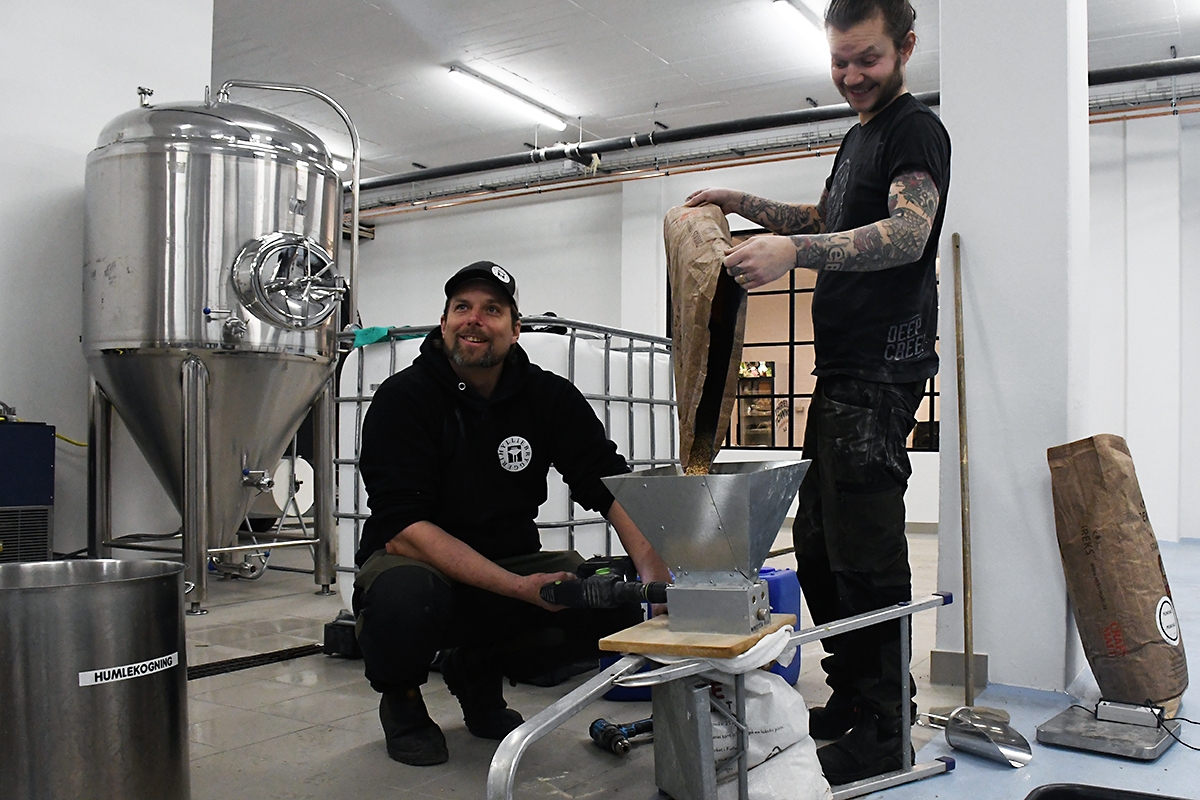 Michael Nathhorst och Johan Lagcrantz krossar malten på gammalt hederligt sätt i väntan på den nya utrustningen.