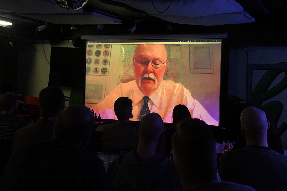 Via en videolänk kunde han bjuda på kunskap och humor kombinerat med nio öl från Franken och det blev förstås uppskattat.