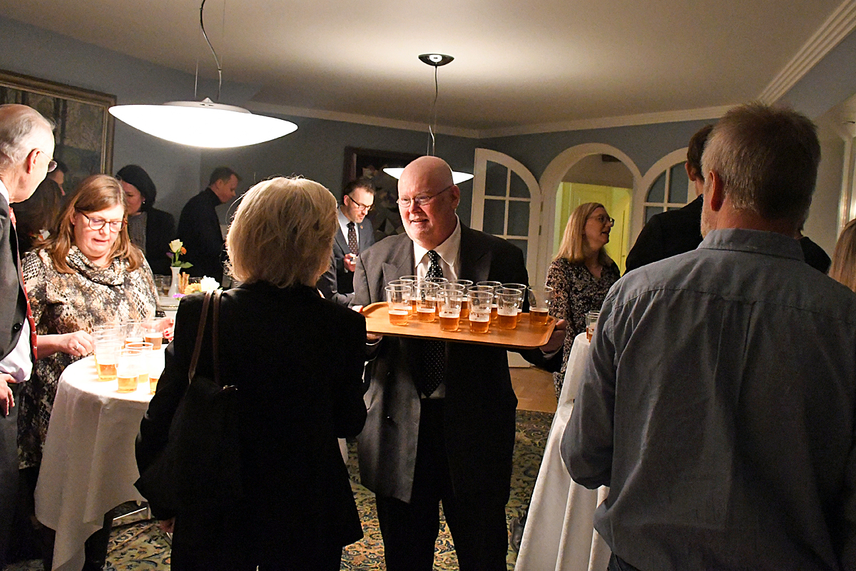 Runt 25 personer dök upp i den tjeckiska ambassadörens residens och nyfikenheten var stor när Svensson berättade om hur det ljusa lagerölet växte fram i Tjeckien under 1800-talet.