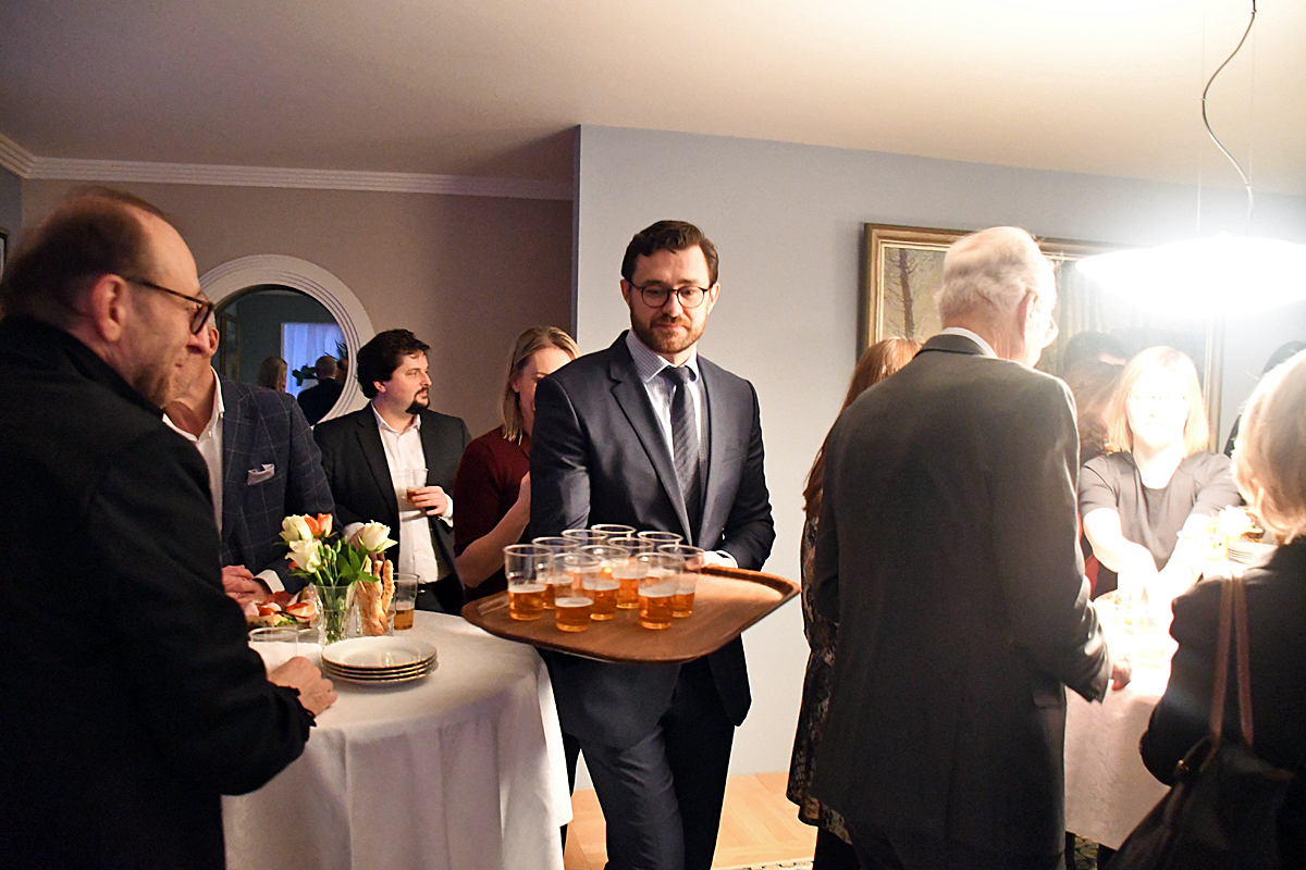 Runt 25 personer dök upp i den tjeckiska ambassadörens residens och nyfikenheten var stor när Svensson berättade om hur det ljusa lagerölet växte fram i Tjeckien under 1800-talet.