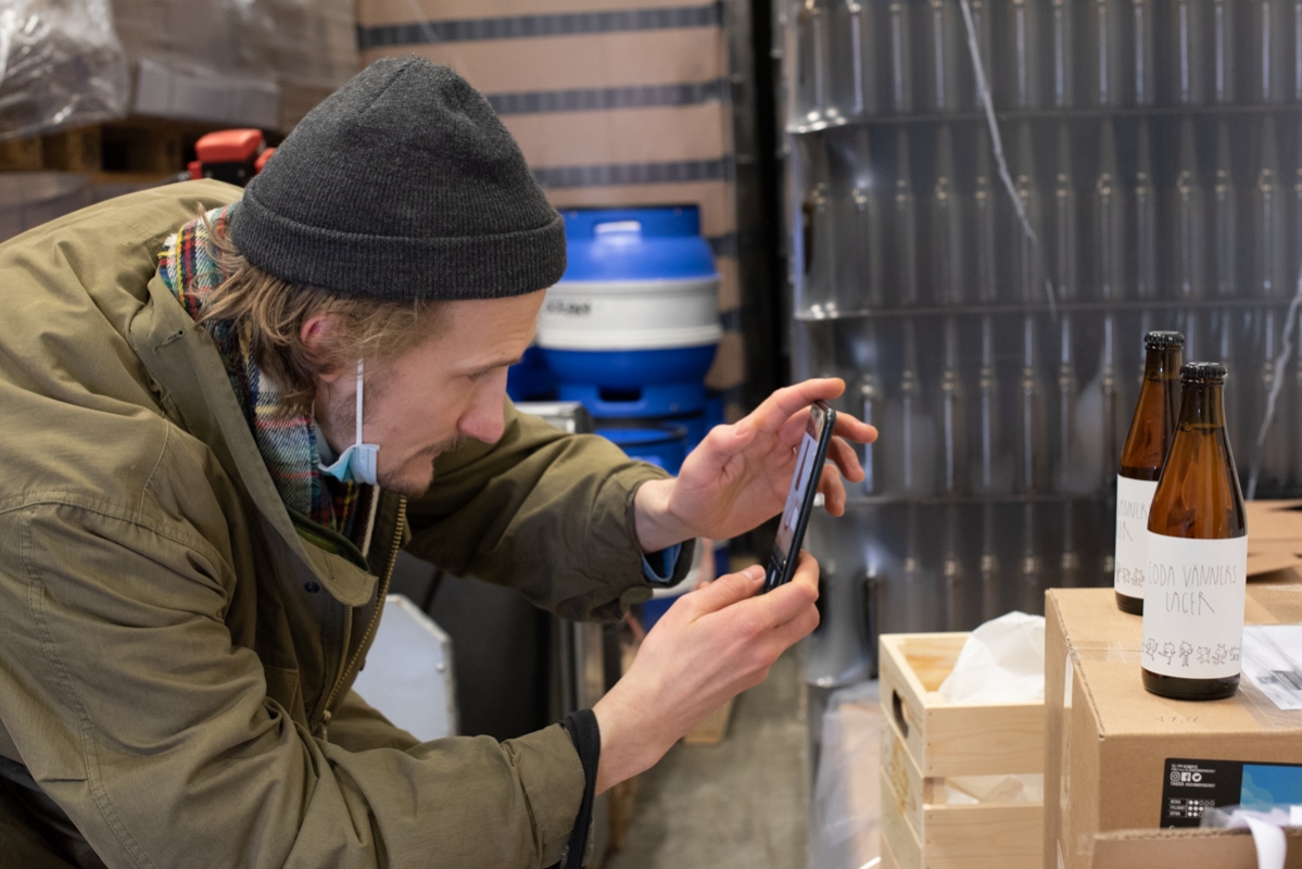 Marcus Berggren plåtar testflaskorna med etiketter.