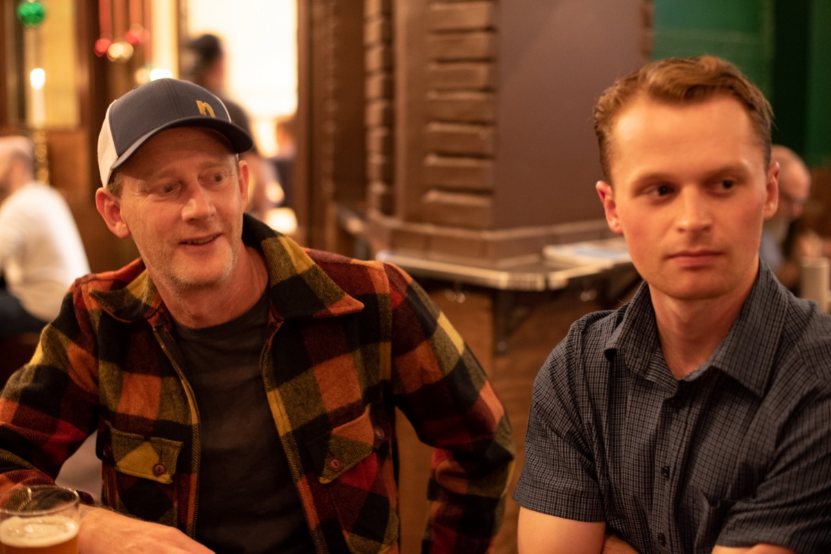 Så här glada är Brisket and friends kökschef Christoffer Johansson och restaurangchef Wilhelm Kappen när de får stämpla ut och dricka öl i stället.