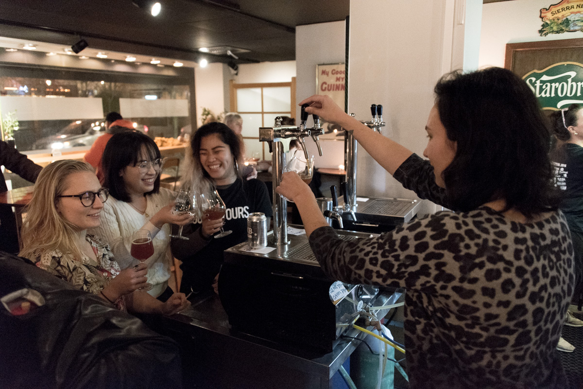 Denise Formsma från Nordic Kiwi Brewers serverar Fir Fox Sake på Haket i Göteborg till Stella Cederbom, Sara Thalathaisong Sjögren och Kelly Ly Tran. Privatbild