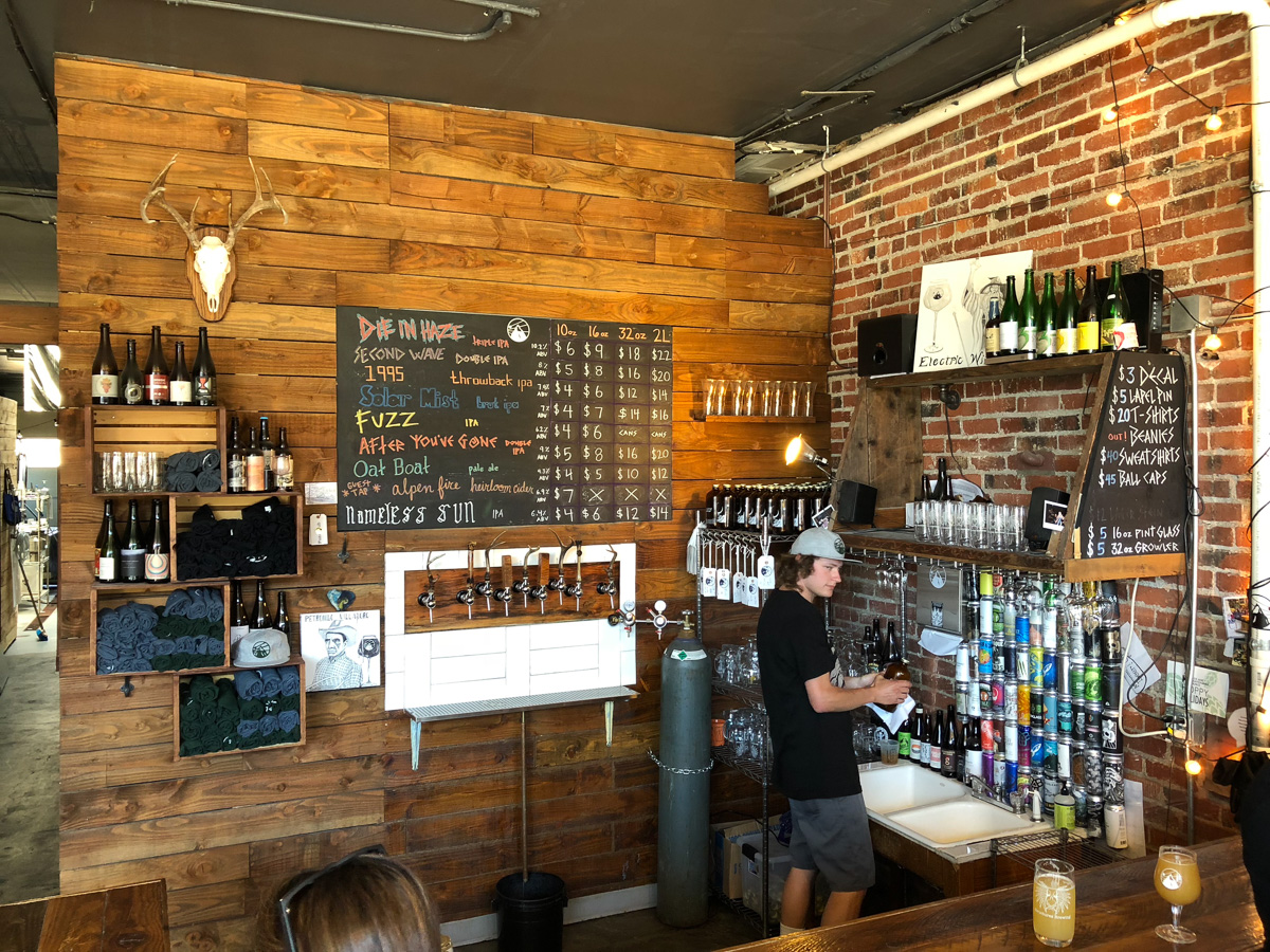 Bryggeriet hade en snygg, vitmålad pub med bordsservering och utsikt mot solnedgången – och tågspåren. Ingen avsmakningsbricka men 6 oz i taget (ca 15 cl) fungerade för att prova några olika öl. Först fick vi några stabila Iindia pale ales – både grumliga och klara – men uppmanades av vår servitris att inte blanda med det funkiga. Så först därefter fick vi ett par milt brettade saison, som var riktigt balanserade och goda.