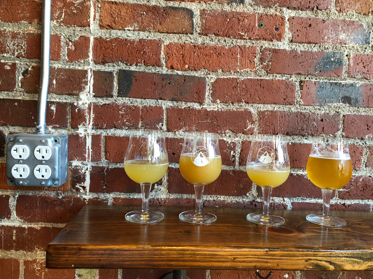 Bryggeriet hade en snygg, vitmålad pub med bordsservering och utsikt mot solnedgången – och tågspåren. Ingen avsmakningsbricka men 6 oz i taget (ca 15 cl) fungerade för att prova några olika öl. Först fick vi några stabila Iindia pale ales – både grumliga och klara – men uppmanades av vår servitris att inte blanda med det funkiga. Så först därefter fick vi ett par milt brettade saison, som var riktigt balanserade och goda.