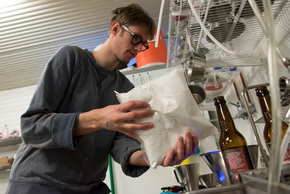 Det verkar rätt lugnt till att börja med. Att tillsätta malten sker automatiskt i ett flöde där den krossas och sen blandas med det upphettade vattnet direkt. Men vi brygger imperial stout på nio procent och krossens påmatningstratt räcker inte till för all malt. Det är dags att börja jobba.