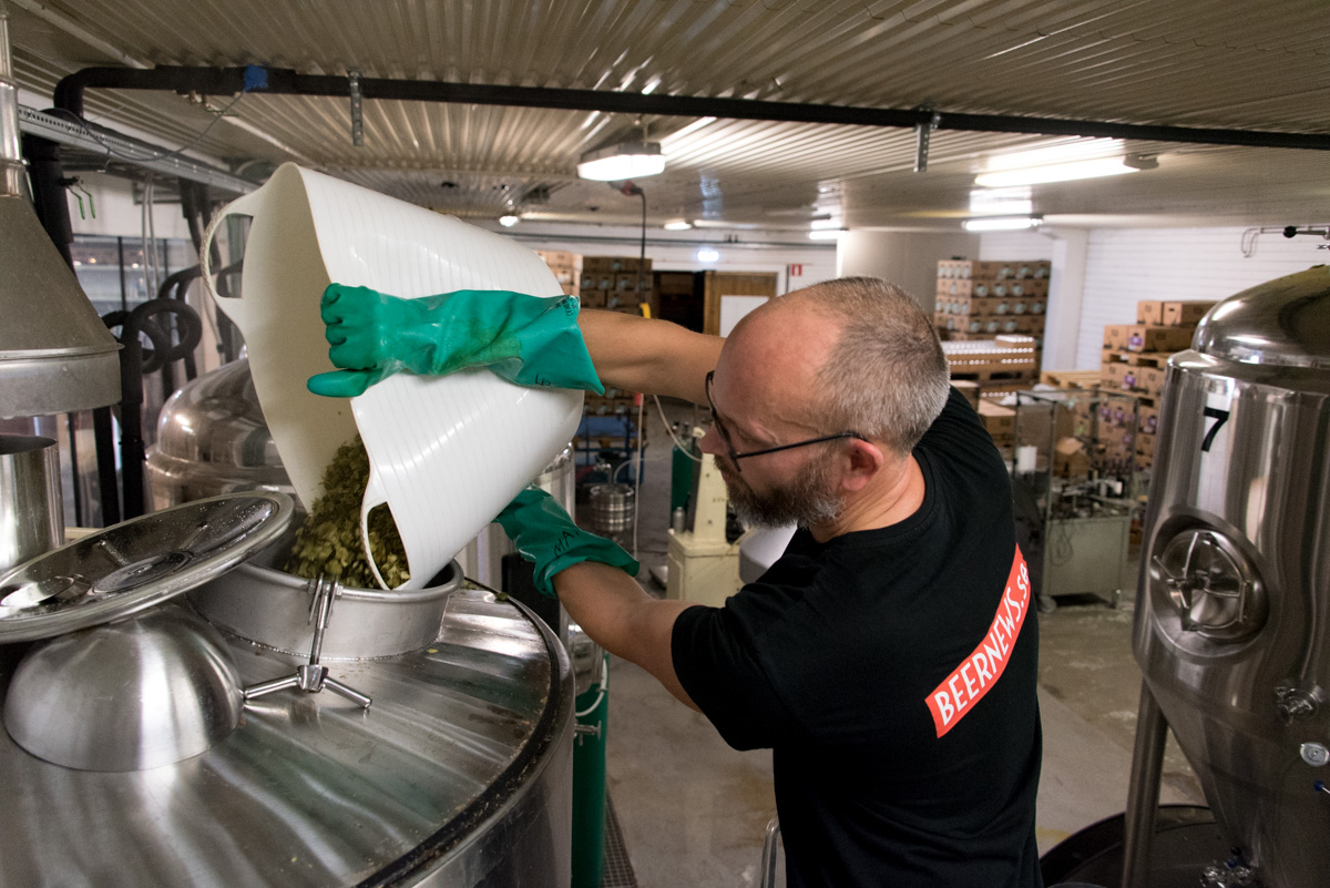 Det verkar rätt lugnt till att börja med. Att tillsätta malten sker automatiskt i ett flöde där den krossas och sen blandas med det upphettade vattnet direkt. Men vi brygger imperial stout på nio procent och krossens påmatningstratt räcker inte till för all malt. Det är dags att börja jobba.