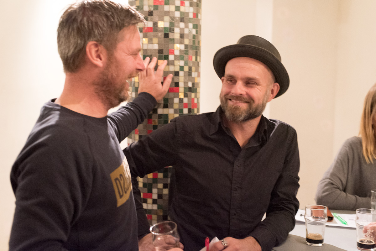 Anderas Welander och Björn Olsson pratar och dricker öl.