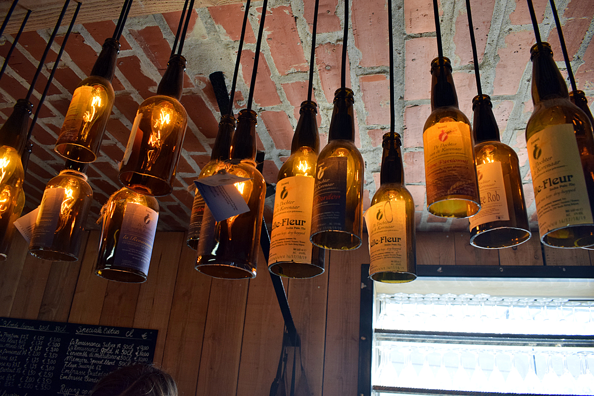 Lamporna gjorda av de egna ölflaskorna ger en mysig stämning i bryggeripuben.