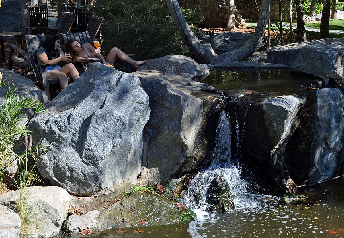 Den enormt stora utomhusdelen är sedan otrolig. Efter de första borden utomhus kommer du till en grusgång som tar dig ett varv runt den enorma utedelen och här kan du slå dig mer bredvid små vattenfall eller i en lummig lite avskild del bland palmer och andra träd.