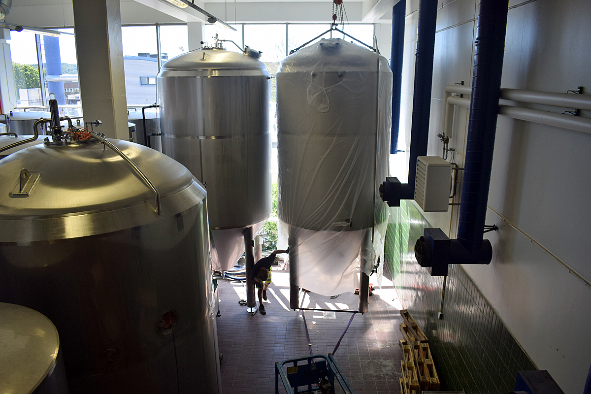 Ännu återstår en del jobb med att ha tanken i produktion, men under måndagen gjordes det stora jobbet med att få in den i bryggeriet. Med hjälp av en effektiv kran och en hel del manuellt jobb kunde tanken ställas på plats. Vid vissa passager var det inte många centimeter till godo, men nu är den på plats och snart blir det mer Starkpilsner till den växande skara öldrickare som väljer just den.